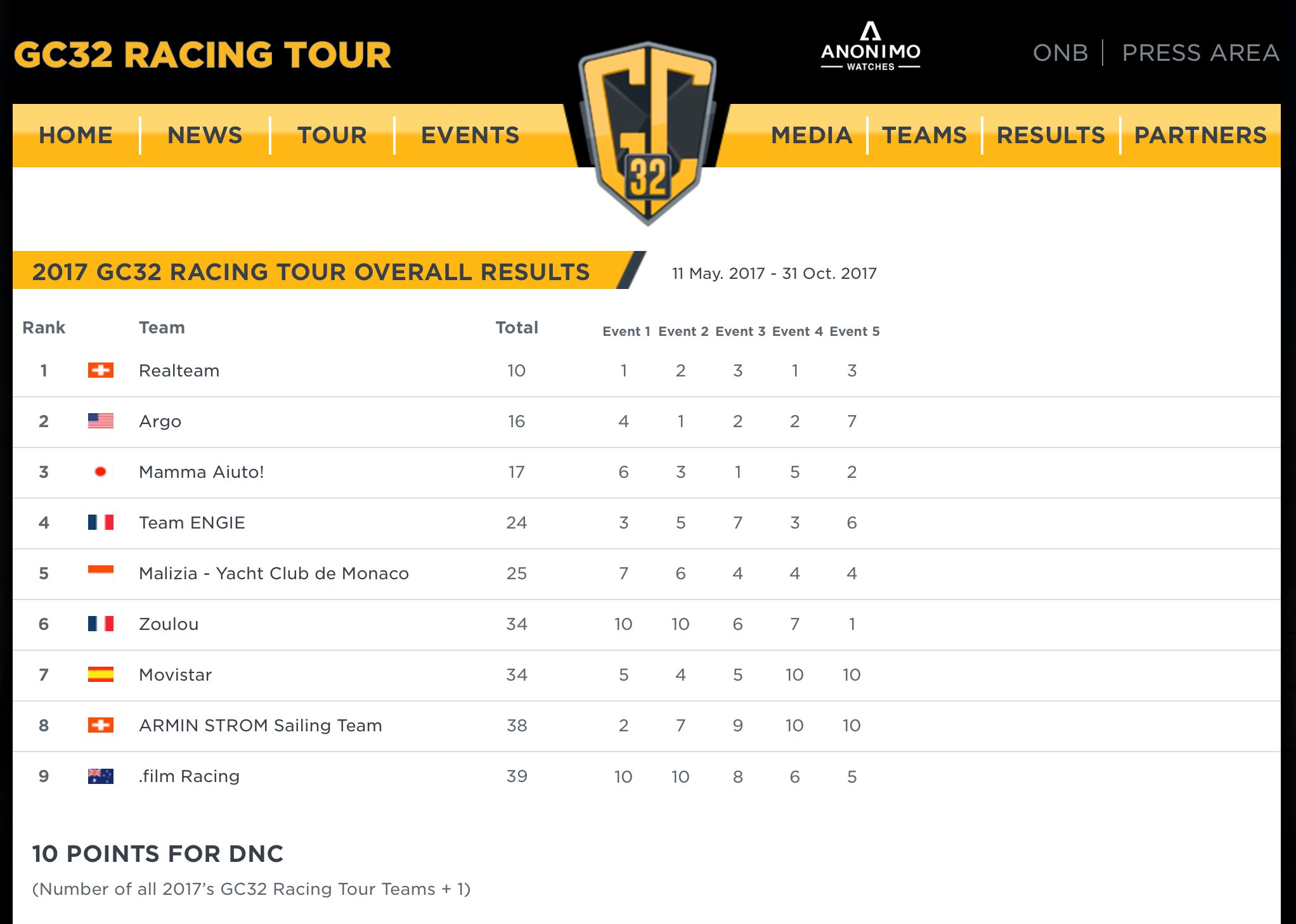 Mamma Aiuto !, de Naofumi Kamei prend la troisième place du championnat, une belle victoire pour le propriétaire du catamaran. Le Team ENGIE de Sébastien Rogues termine 4ème du GC32 Racing Tour et ne sera pas présent l’année prochaine, Malizia prenait la 5ème place.
