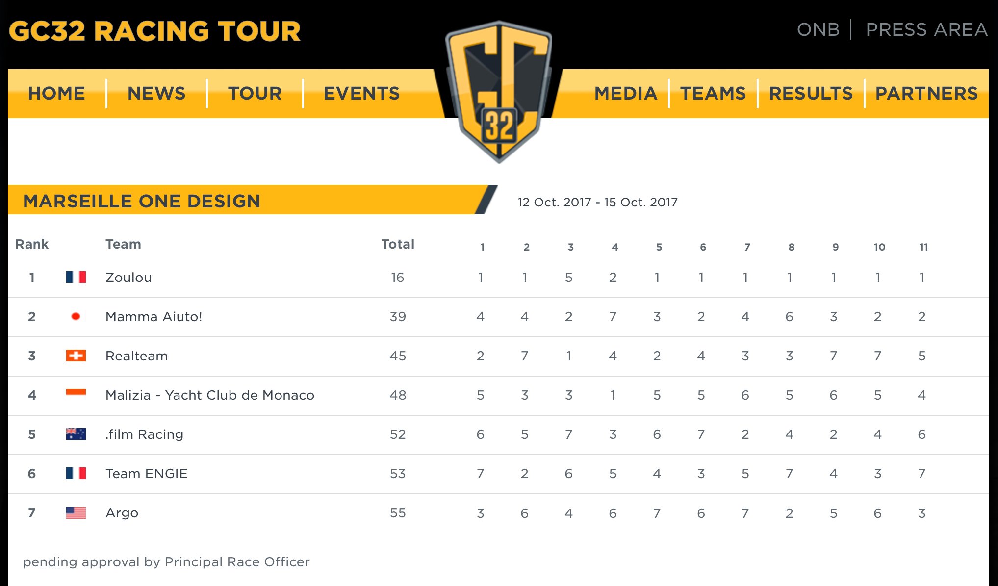 Cette troisième place suffisait à Realteam pour remporter le championnat 2017 avec deux victoires d’étapes, une seconde et deux 3èmes places, l’équipage suisse terminait avec 6 points d’avance sur le Team Argo, qui terminait sur une décevante 7ème place à Marseille.