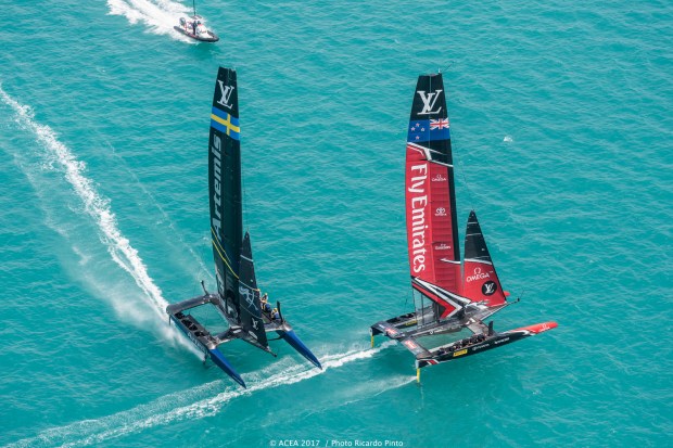 Emirates Team New Zealand revient à 11s des anglais sur le premier près puis revenait inexorablement grâce à une meilleure vitesse, et dépassait Land Rover BAR qui s’inclinait pour 31 secondes.