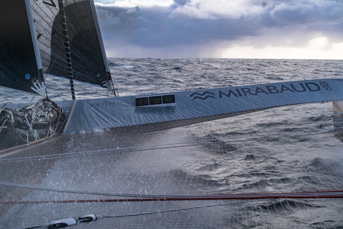 « C’était quand même chaud ! Le bateau faisait un peu le fou. La mer n’était pas orientée dans le même sens que le vent, ce qui complique beaucoup le truc. Le bateau tapait énormément par moments… On s’en sort sans trop de casse, juste avec deux ou trois bricoles à réparer comme la protection pour le barreur, mais rien de grave. On a affronté ces 24 premières heures avec un peu de réussite, pour ce qui est du passage dans la mer et de la route accomplie. »