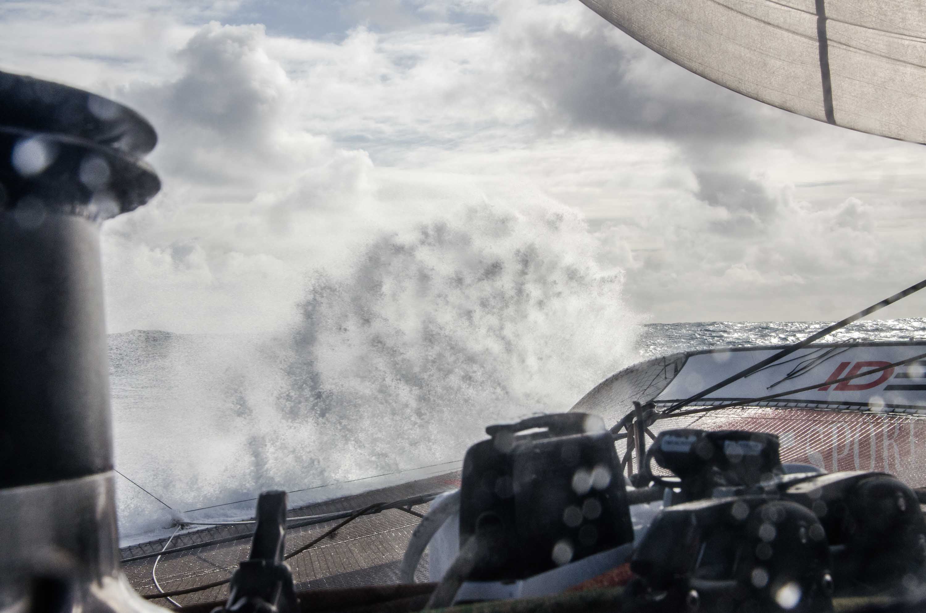 F.J. : « Actuellement, il fait gris, on voit à 500 mètres, la visibilité diminue, la température extérieure est de 7°. Il y a toujours de la brume, et c’est normal dans cette partie du monde. Mais surtout nous bénéficions de conditions idéales pour tenir des hautes vitesses dans un angle de vent très favorable. La mer n’est pas encore trop formée. Hier, nous avons réussi à aller plus vite que le système de vagues qu’on a pu dépasser. Tout l’enjeu consiste à rester à l’avant du front dépressionnaire qui nous pousse. Plus en arrière, cela complique les choses dans des vent plus irréguliers et sur une mer plus croisée.  Si tout se passe bien, on peut espérer rattraper ce retard sous l’Australie, au niveau du cap Leeuwin. Actuellement, nous avons encore 30 nœuds, nous nous apprêtons à renvoyer un ris dans la grand voile pour bien suivre les évolutions du vent et maintenir le rythme le plus élevé possible. »