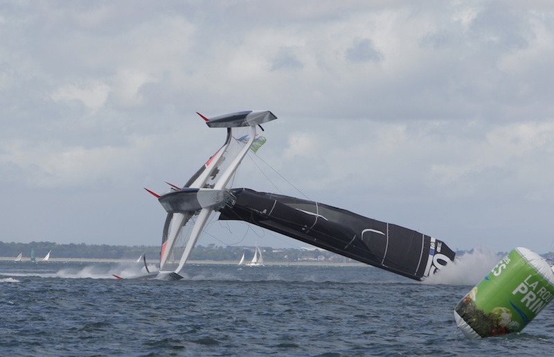Le MOD70 Spindrift a chaviré en début d’après midi lors de la première manche des régates In-shore de la Route des Princes à Dun Laoghaire. L’équipage a rapidement été récupéré, Jacques Guichard, le frère du skipper  et équipier du trimaran, a été blessé lors du chavirage, il souffre de fractures du bassin.